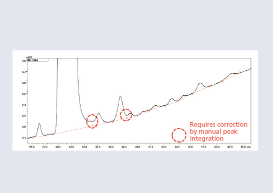 Liquid chromatography is now an indispensable analytical technique used in pharmaceutical, food, and a wide variety of other industries. In these industries, there is a need for efficient data analysis methods that are not user-dependent. Peakintelligence for LC software includes AI algorithm* that was developed by learning expert peak integration skills. That enables peak integration on par with that of an experienced user without configuring/adjusting parameter settings, which reduces data analysis times by approximately 75 %. Consequently, it makes data analysis results less dependent on specific personnel, inhibits arbitrary changes to data during manual peak integration, and provides more efficient data processing workflows.